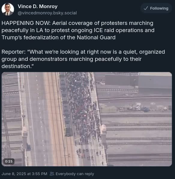 Please, folks in L.A., stay safe! This calling in of the National Guard without the state or city’s request is unlawful and against the constitution. People in my age bracket and older, remember Kent State. It only takes one idiot to start and ordinary citizens, protesting the pseudo-Nazi regime, will die.