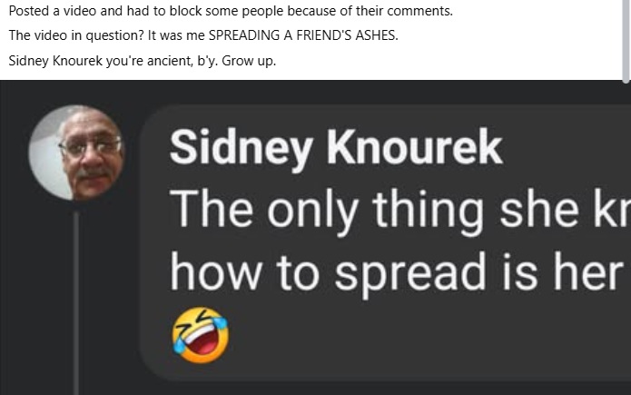 I am curious, okay, morbid curiousity, but what toxic fumes have decimated your brain to the point where you thought this was a good thing to do? It isn’t freedom of speech (as a Canadian, you should be aware that we do not have that in our Charter, that’s an American thing), what you allowed yourself to do, to post for all to see, as it was a public forum, was offensive, had no merit and frankly, was as disgusting a comment as could have been uploaded.